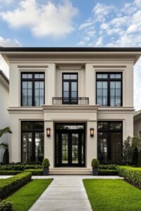 Model ini paling ikonik untuk rumah Amerikan klasik. Warna putih menegaskan kesan bersih, simetris, dan mewah, sekaligus menonjolkan detail jendela besar khas Amerika.